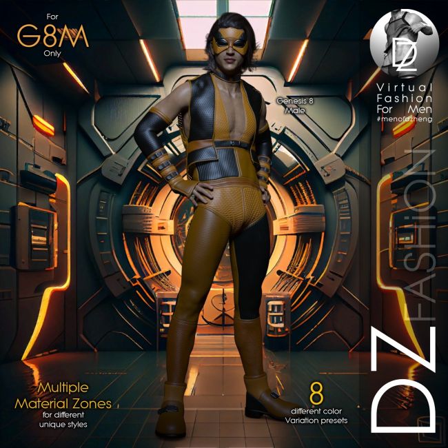 Bring futuristic edge to your renders with Dark WaveZ for Genesis 8 Males. This sci-fi inspired outfit includes a full-body with sleeveless vest, gloves, boots, and a sleek eye mask. The set features multiple material zones and comes with 8 unique color presets for versatile styling. Ideal for action, superhero, or cyberpunk scenes. Includes GenFits and adjustment morphs for a perfect fit.
