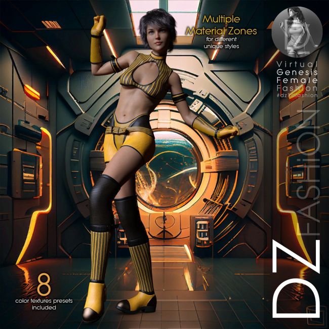 LeatherZ 2 brings a tough, edgy look to your Genesis 8 Females with this sci-fi inspired clothing set. The outfit includes a crop top, high-waisted shorts, gloves, arm bands, and matching boots with thigh-high leg covers. With 8 stylish color texture presets and multiple material zones, it's easy to customize your character’s look for any setting. Adjustment morphs are included to fit various body shapes.