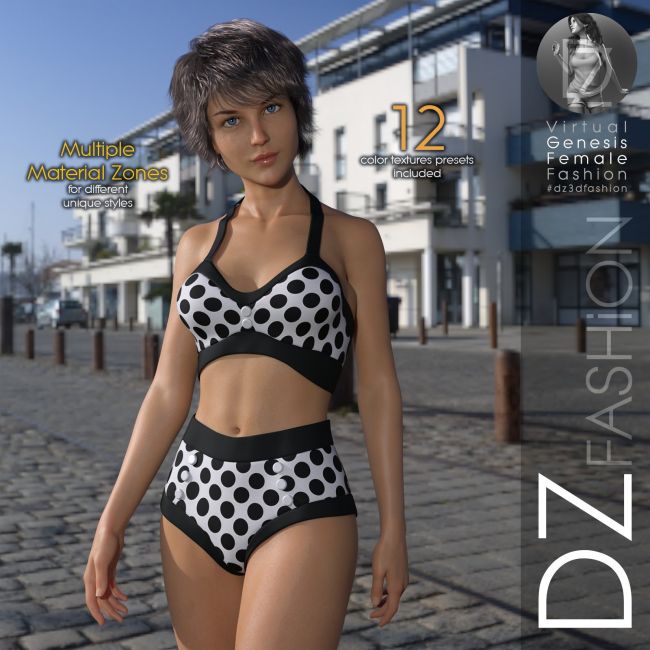 Set sail with "Nautical Charm," a captivating swimwear collection from the Virtual Genesis Female Fashion lineup for Daz3D Genesis 8 Female. This collection features bold polka dots and vibrant stripes that evoke the timeless spirit of the sea. Each piece is crafted with multiple material zones, allowing you to customize and adapt the swimwear to match the unique style of your scenes. With 12 versatile color texture presets, "Nautical Charm" offers endless creative possibilities, ensuring that every digital model can look both classic and contemporary. These swimsuits are perfect for beach day renderings or stylish nautical adventures, bringing a wave of elegance and a splash of color to your digital wardrobe. Dive into "Nautical Charm" and let your Genesis 8 Female characters shine with a sea of style!