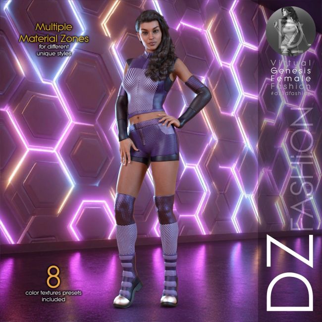 Dress your characters for the future with RavageZ 2 for Genesis 8 Female. This sporty sci-fi outfit features a high-collar cropped top and matching fitted shorts, perfect for tactical missions or futuristic workouts.