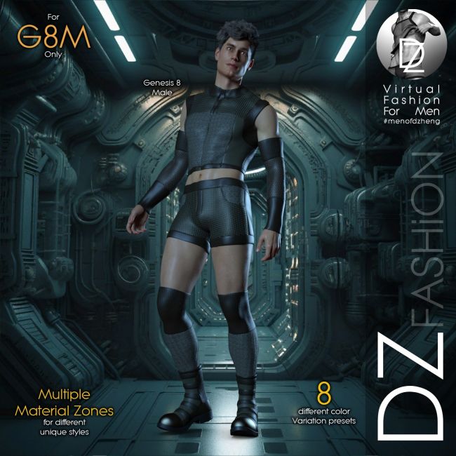 RavageZ 2 is a futuristic clothing set designed for Genesis 8 Male characters. This sci-fi inspired outfit includes a sleeveless armored-style top, short fitted shorts, arm guards, thigh-high leg guards, and boots. The set comes with 8 different texture presets and multiple material zones, giving you plenty of options for customizing your look. Perfect for cyberpunk, sci-fi, or dystopian scenes. Adjustment morphs are included for body shape compatibility, and GenFits morphs are added for male characters.