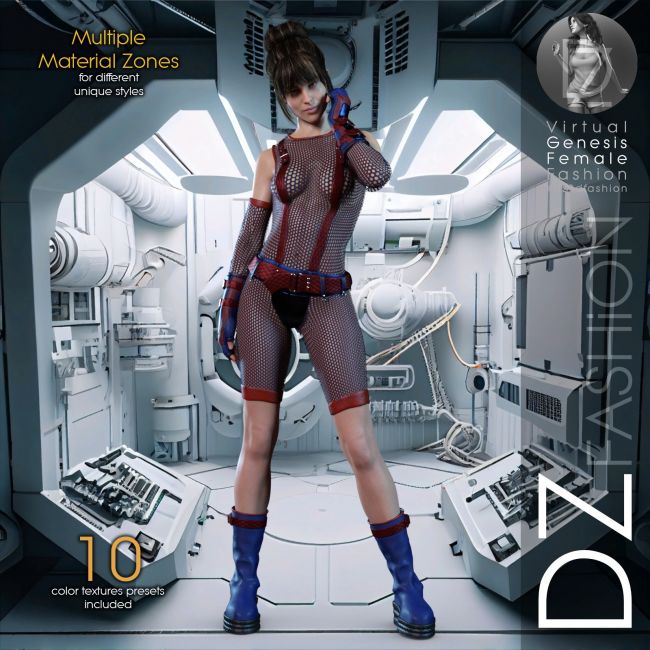 This edgy Sci-Fi-inspired outfit includes a full mesh jumpsuit, elbow gloves, fingerless gloves, and heavy boots. Built for bold looks and high-action renders, each item includes multiple material zones and comes with 10 unique color texture presets. Great for space, cyberpunk, or futuristic scenes. Adjustment morphs included for better compatibility across Genesis 8 female characters.
