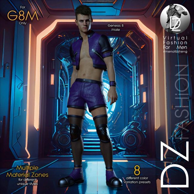 The Sentinel Leather outfit is a bold and futuristic fashion set made exclusively for Genesis 8 Male characters. This edgy clothing pack includes a cropped short-sleeve jacket, fitted shorts, thigh-high mesh and leather legwear, and ankle boots. With 8 different color presets and multiple material zones for easy customization, this set is perfect for sci-fi, clubwear, or cyberpunk scenes. GenFits morphs and adjustment morphs are included to ensure a great fit on a range of Genesis 8 Male body shapes.