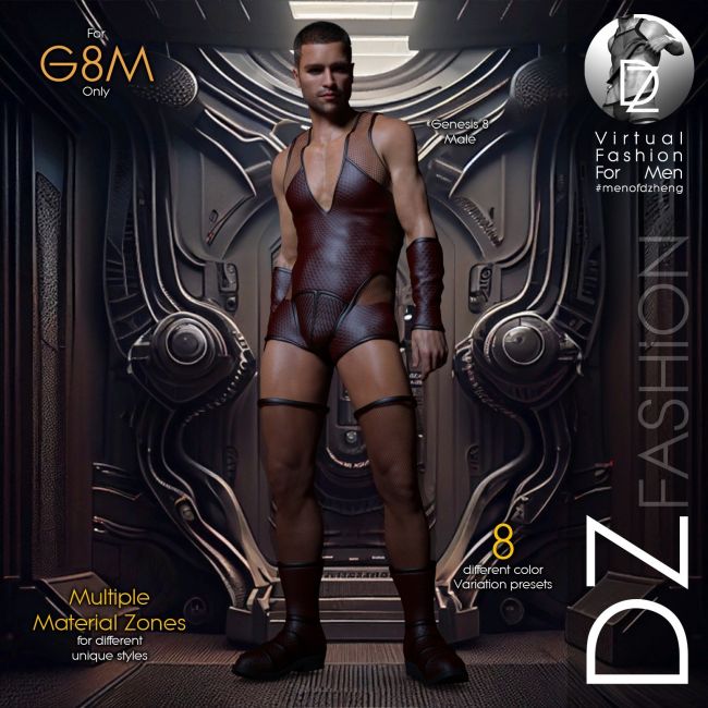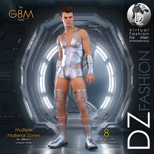 This bold futuristic fashion set for Genesis 8 Male includes a deep V-cut bodysuit, thigh-high boots and arm bracers. It comes with 8 color presets and multiple material zones for easy customization. Adjustment morphs are included for body shape fitting, along with GenFits morphs for G8M.