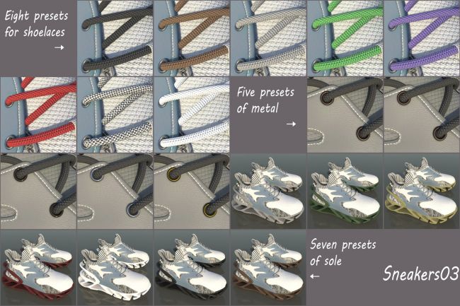 It includes 28 Base Colors for Boots, 6 Dirt Colors, 23 Laces Colors, 23 Sole Colors,3 Metal Colors, 5 Decoration Colors and 13 adjustment morphs. You can adjust it to suit your character's needs.