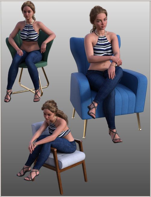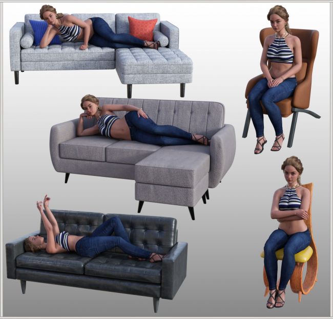 A set of poses for FG Sofa and Chairs adjusted for Genesis 9 Feminine with 20 Anywhere poses and Go to poses.