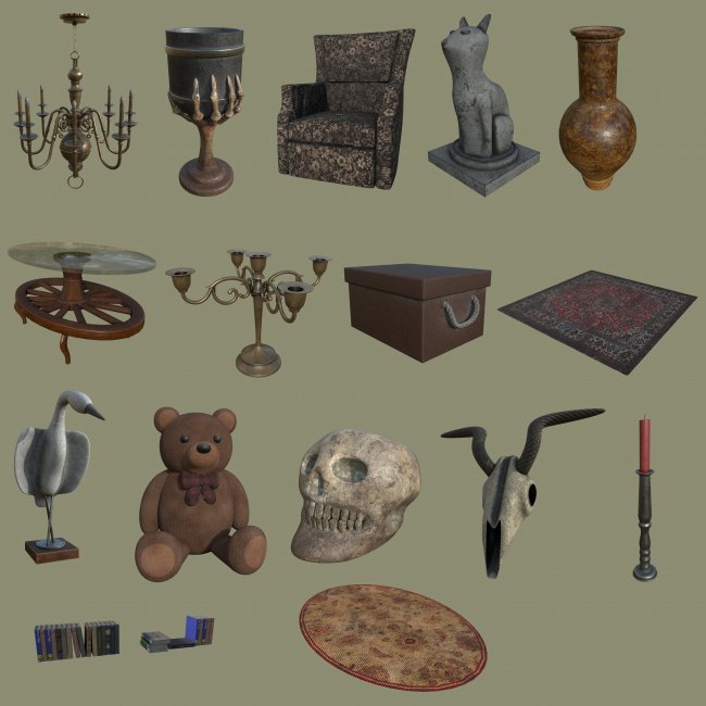 This environment is a main room of an old house designed to look creepy and scary in moody low light. There are a collection of props to add detail to the setting.