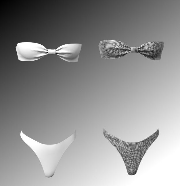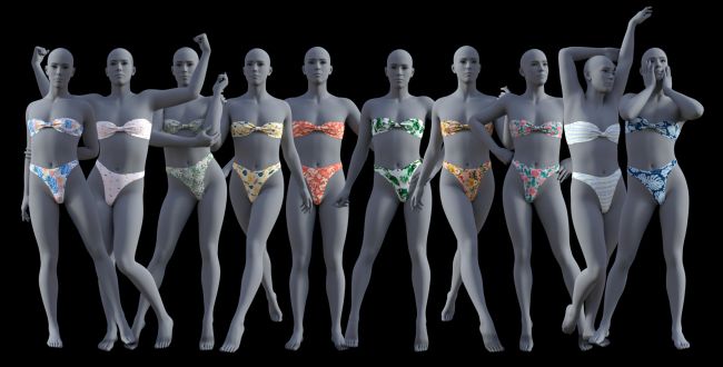 A stylish 2-piece bikini with 10 texture sets and undress morphs.