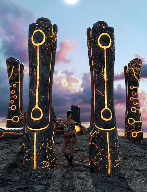 The Foreverstones come to you as a prop set with 13 individual props as well as sub-sets of five pillars in various states of ruin, and two stone circles, with four texture options that adorn them with red, green, blue, or non-glowing pictoglyphs. Also included is a ground prop to get you started.