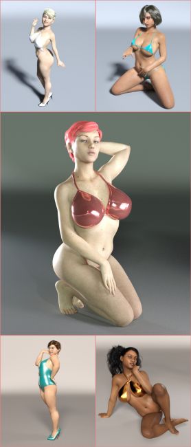 A collection of 5 more pinup type poses for Genesis 8 Female (designed around the default shape). To use, select a figure and load any of the pose files; adjust for contact with floor/other objects and/or body shape as required. Can never have too many poses right?