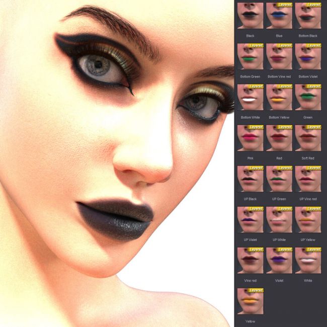 Metal Flakes presets for both eyeshadows and lips. Color can be changed in Surface tab Metal Flakes.