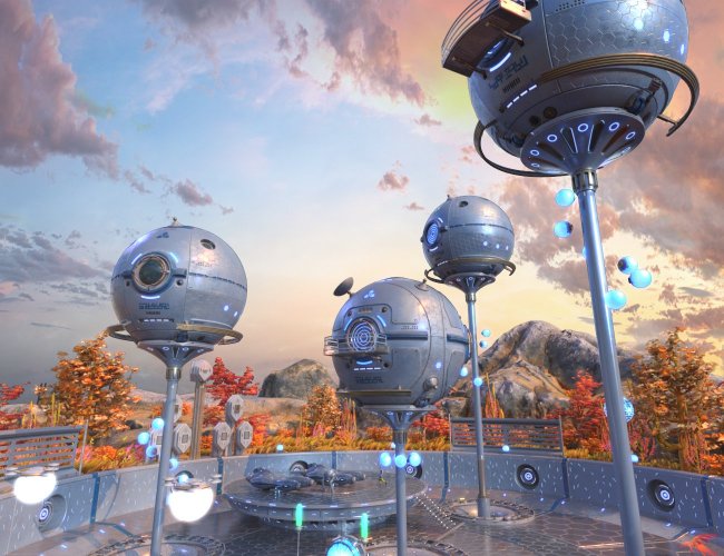 Gaya Town is a settlement of an ancient civilization that lived on the planet Edessa. The town's spherical housing units are suspended mid-air and attach to the platform below with towering fuel lines. This set includes a figure of a platform and props with color options and textures.