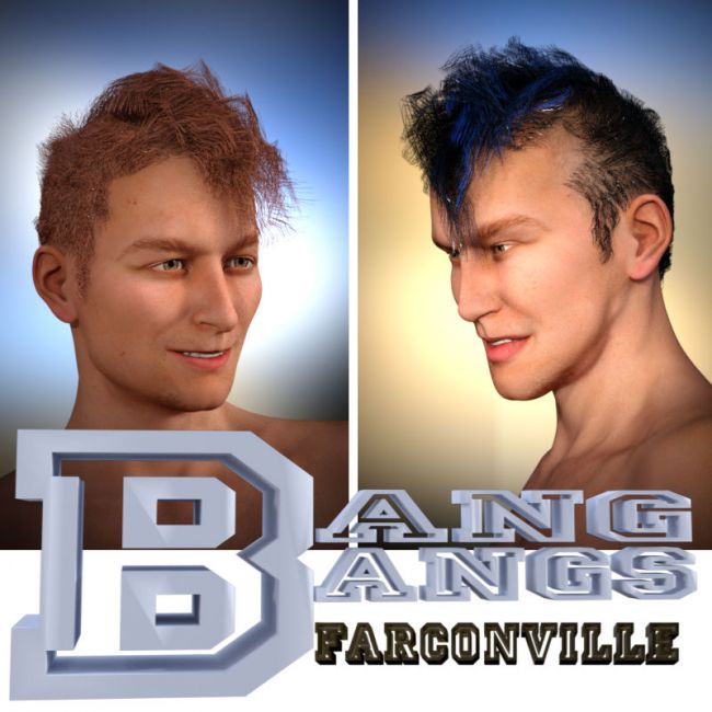 Bang Bangs hair was made especially for Genesis 3 Male and Michael 7 with colors and styles to choose from. The Bang Bangs hair comes with morph sliders. Your imagination is the only limit.