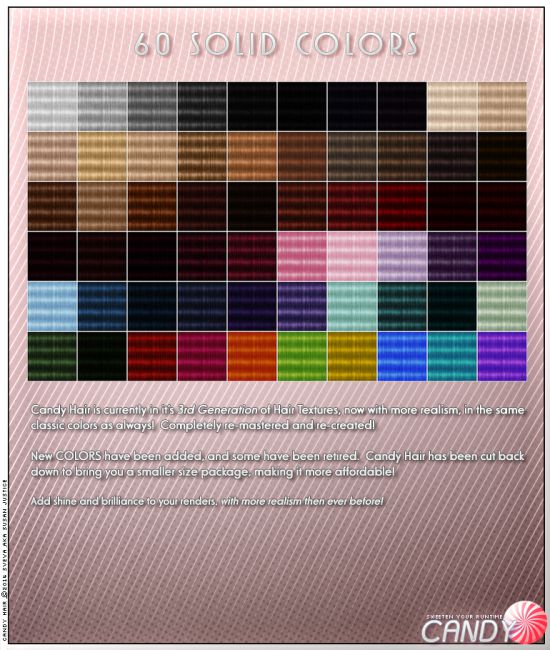 Candy Hair comes in 115 custom blended colors - it has been designed with a combination of real hair resources, digital painting, and special effects for a beautiful & realistic style.