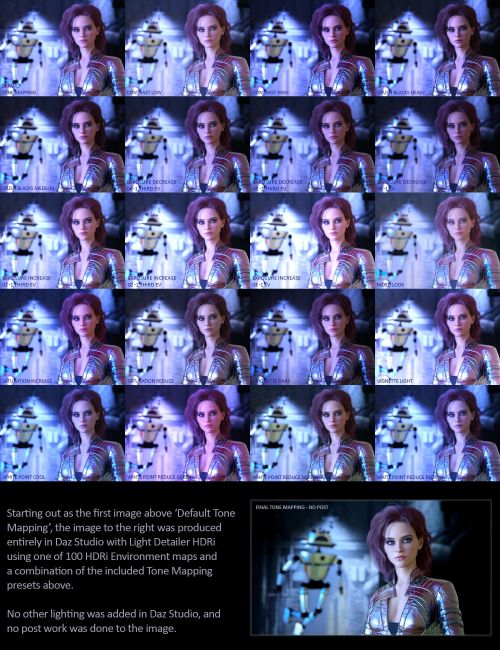 Everything you see in the product images demonstrates just a selection of the included HDRi lighting environments. No post-work was done, apart from minimal brightness and contrast adjustments.