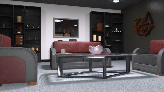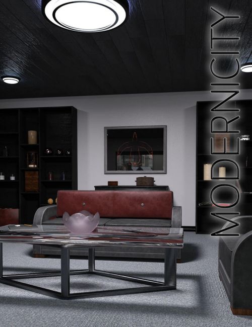 Modernicity is a small, fully furnished, modern room location. All objects use iray materials. The pictures are made using Weave Silk, which is CC-BY-3.0. The blinds and light switch have morphs, and the clock can be posed.