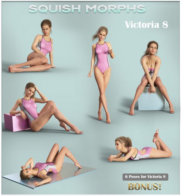 This Squish Pack and poses are made for both Genesis 8 and Victoria 8 Females. These dial based morphs that need to be dialed up manually. Easily MIX & MATCH the morphs to your hearts desire.