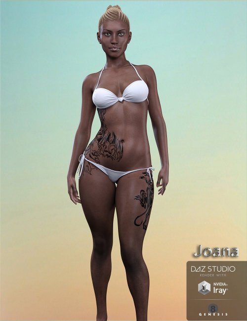 Joana is a beautiful ethnic character for Genesis 8 Female, with an unique, exotic beauty. She is perfect for all your scenes. She has a separate body and head morphs, and two texture options- with and without tattoos. There are also 4 eye and 6 lip options. The textures are Iray only.