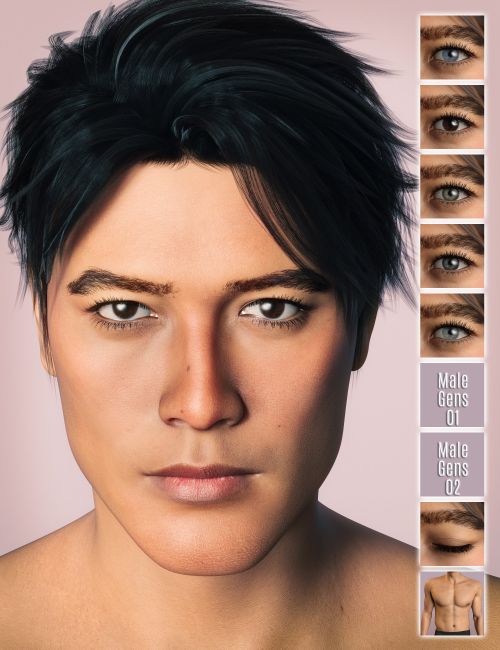 Waki is a young male character with Asian roots. He features an HD sculpted face, an athletic body shape, a distinctive photorealistic skin, and five eye color options.