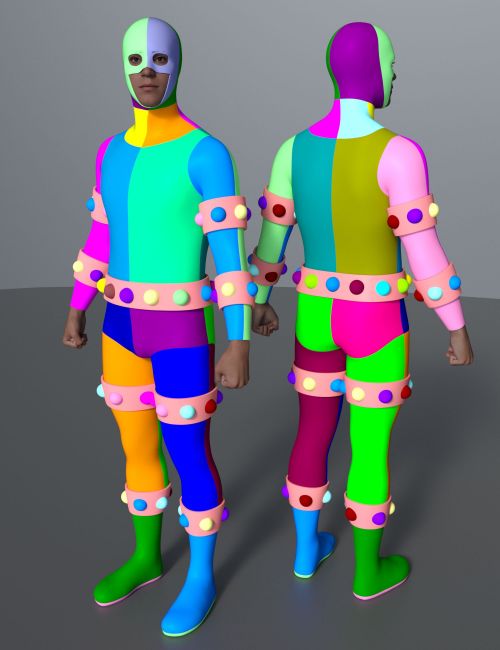 This set features: Cowled Tops 002, Bottoms 005, Strap 014, Armband 004, Forearmband 004, Thighband 004, and Shinbands 004
