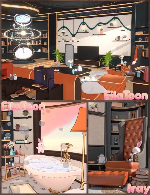 A charming and versatile room featuring both cartoon and IRAY rendering presets, offering comprehensive scene support for your cartoon-style projects. Every prop within the environment is fully customizable, allowing for seamless replacement and modification. Ample lighting ensures a vivid and imaginative workflow. Additionally, the bathroom glass provides three distinct material presets, all freely adjustable to suit your specific creative needs. We sincerely hope your character enjoys a delightful experience within this space.