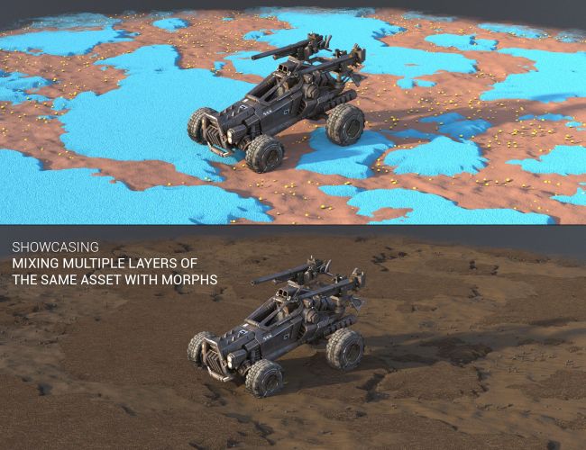 It also includes three different scattered pebble and rock layers that align with the terrain base shape, each with a morph that lowers them to a flat floor plane so they can be used elsewhere as fillers.