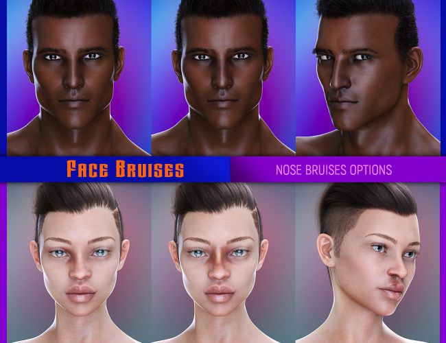 "L.I.E. Face Bruises for Genesis 3/Genesis 8" allows users to give their renders that extra dose of detail via 31 different hand-painted bruises. What's more, you get a mirror version for 28 of those, which gets you a total of 59 Presets per gender and generation.