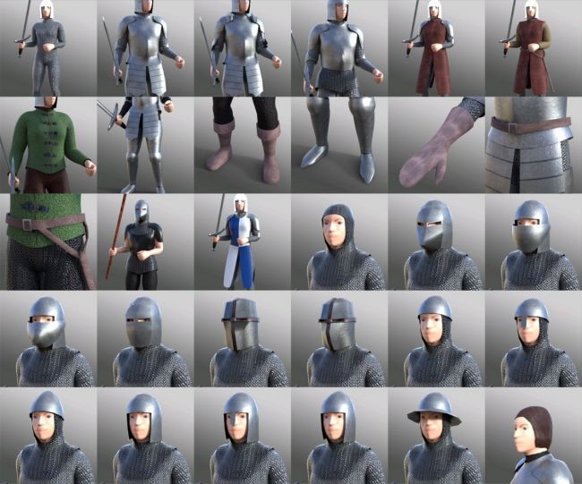 There is a choice of full armour, half armour, colorful surcoats, tabards and jerkins to dress your soldiers in with an array of accessories such as boots, gauntlets and belts. Of course these are all available in a wide range of colors and patterns, adding huge variety to your generated groups. Add to that a choice of weapons from a long sword, battle axes and maces, two-handed pole weapons and bow and arrow. Presets are provided with and without shields, and there is a huge variety of presets for shield designs and tunics with or without emblems.