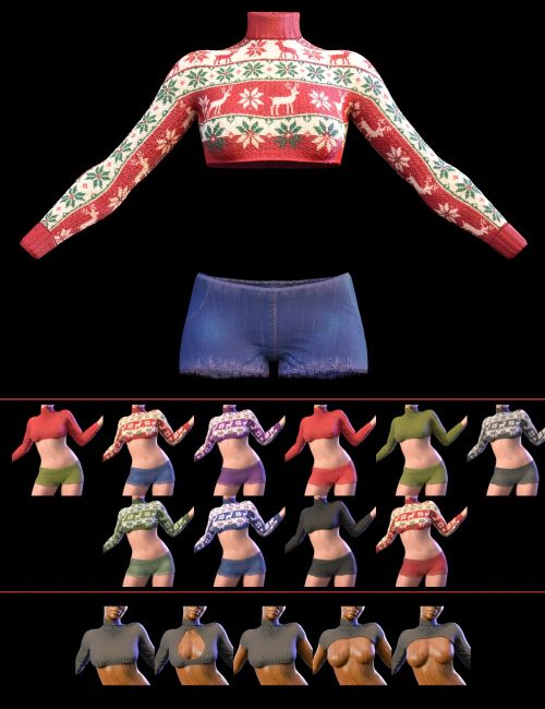 The outfit comes with multiple sweater styles, from classic holiday patterns to modern cut-out variations, along with a wide range of Iray material presets, including vibrant seasonal colors and soft neutrals.