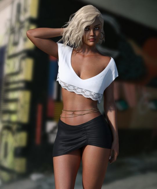 Introducing Malia for Genesis 8 and 8.1 Females. Malia is a drop-shoulder crop top and ruched mini skirt skirt set, ready for any summer-time party, or as a bathing suit cover-up at the beach!! Also included are 3 belly chains to give the outfit a little sexy vibe.