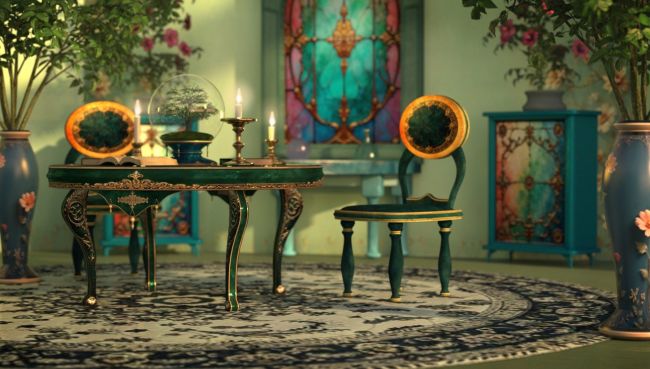 The mystic abodes table and surrounding chairs are of a sophisticated antique design, and they come with a variety of incredibly detailed custom textures that can be applied for different looks in your Mystic Abode scene.