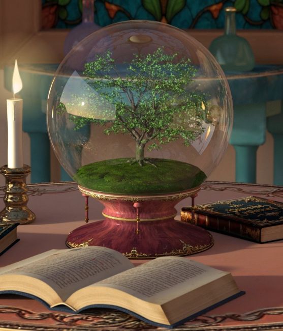 MGX Mystic Abode is a fantasy-style whole room setup, complete with many highly detailed assets that include an amazing tiny tree with many branches, leaves, and vines on grassy ground contained inside a transparent globe mounted on an exotic stand.