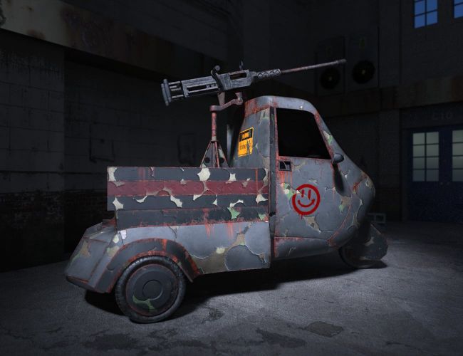 The MTT stands out as a compact yet menacing tactical vehicle, offering strong visual storytelling through its worn textures and weaponized design.