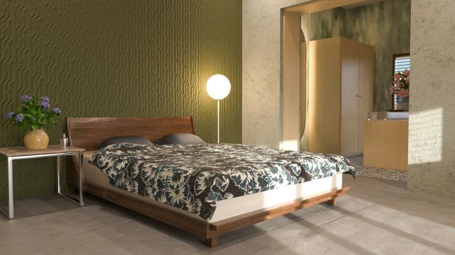 This bedroom scene features a low-profile wooden bed, soft furnishings, subtle lighting, and a cozy lounge area that creates a balanced and serene living space.