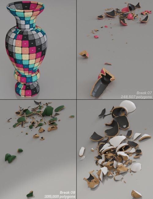 This set includes 6 vases and 54 broken vase props. For each of the 6 vases, there are 9 different breaks, each is the final stage of the break. Each break is technically settled, but some of the smaller pieces might not be directly in contact with the ground or the piece they are sitting on. The different breaks vary in how much they spread out from vase to vase, and either scatter a little or a lot. The promos may not capture the entirety of each break due to how much the pieces spread out. There are 11 full glass presets, 10 full porcelain color presets, 10 full glass with a painted interior presets and 67 partial material presets for the 3 surfaces. 20 frosted glass presets for the interior and outside surfaces are also included.