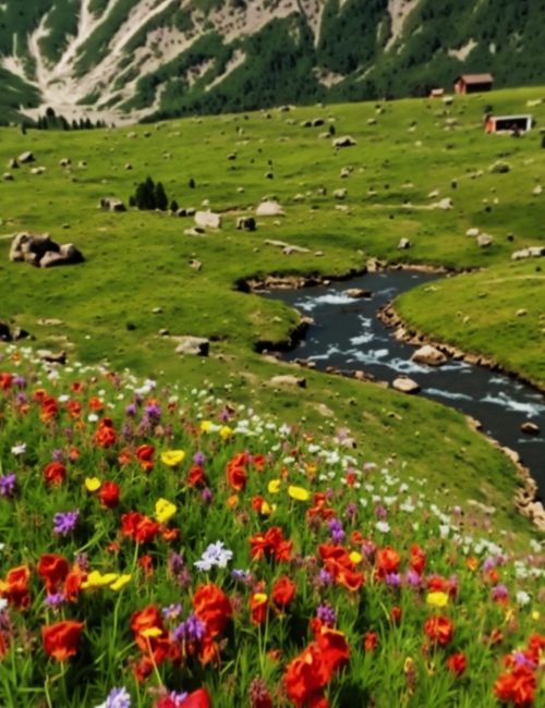 - Along The Alpine Meadow: Immerse yourself in a serene landscape where lush meadows meet rolling peaks, evoking the tranquility and expansive beauty of the great outdoors.