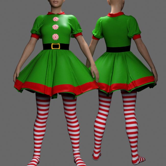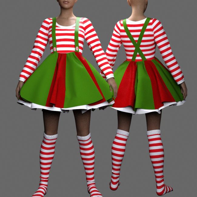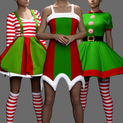 Bring the festive charm of Santa's helpers to your scenes with this special Christmas outfit collection! This set includes three unique elf-themed dresses, each designed with playful holiday details and the classic red-and-green palette to instantly brighten any render.