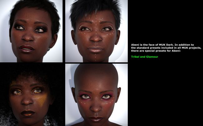 " Abeni " - the included character preset - determines not only the skin tone but also the special makeup options for this project: " Tribal and Glamour ". Just take a look at the promo pics - it's amazing