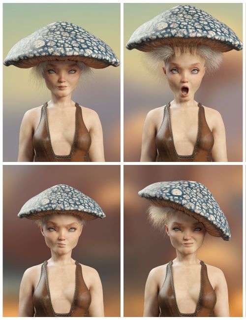 Mushra comes with high definition morphs, fun, realistic textures, and a fully posable geografted Mushroom Cap.