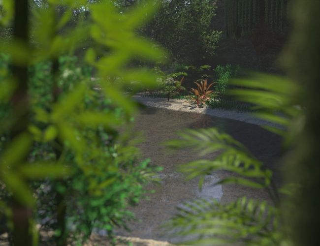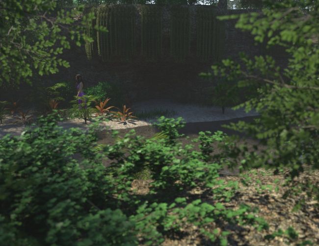 Cross this large and lush rainforest by going upstream and find a small waterfall surrounded by rocky walls covered in vegetation.