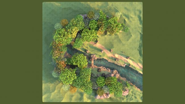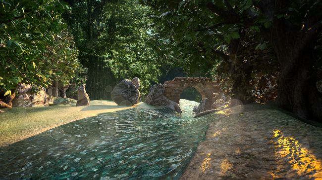 A gently flowing stream winds through the landscape, its centerpiece a stunning stone arch naturally carved by time, bridging the waters with quiet elegance. Surrounded by lush trees, mossy rocks, and soft, earthy textures, this immersive setting offers a peaceful retreat ideal for fantasy, nature, or romantic scenes.