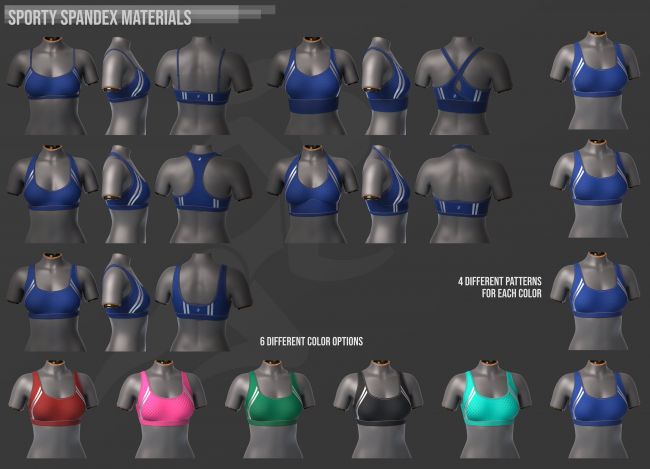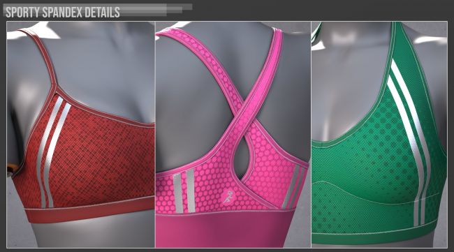 Sporty Spandex includes a more modern textured feel with 6 different colors and 4 different patterns for each color (checkered, dots, hex, and plain). The sporty logo is placed centered on the back and has a metallic material matching the stripes. Metallic "Sporty Girl" text can be added to any texture on the Racerback and Sports Scoop bras.
