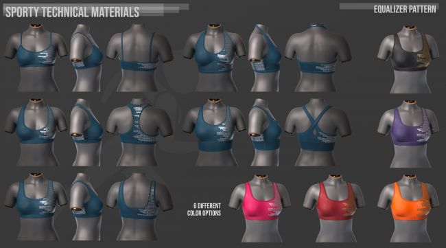 Sporty Technical gives a synthetic/experimental look with a textured base and metallic patterns for an ultra unique look. There are 4 base patterns (Equalizer, Plain, Run and Waves) and each comes in 6 color profiles (3 with silver metallic and 3 with gold metallic). The "Sporty Girl" text can be optionally added to the elastic for any texture on the Racerback and Sports Scoop bras.