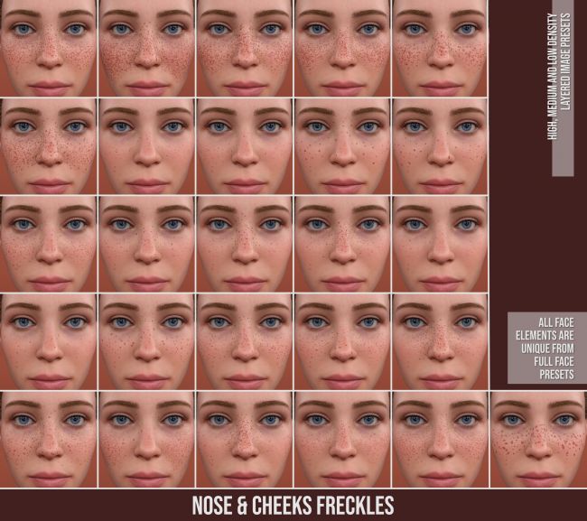 Presets are divided up into 6 different colors to work well with various skin tones. For each color, there are presets to add freckles of varying densities (high, medium, and low) to specific body regions, including the full face, forehead, nose, and cheeks, lower face, lips, ears, and full body (from the neck down). While the face elements are all uniquely separate from each other, the body regions can be added all at once or to separate regions, including arms, legs, or torso. Every preset also comes in two opacity versions: full opacity or 60% opacity (for a more subtle look).