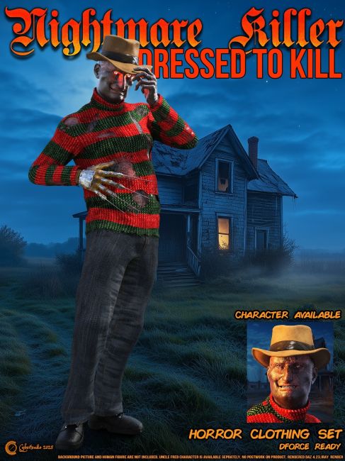 Uncle Fred is one of the most iconic horror monster of all time. Uncle Fred is a an ordinary randon guy who become supernatural serial killer who haunts and kills his victims in their dreams, which leads to their real deaths in the real world. He was was originally a serial killer who was captured but released due to a legal technicality. Seeking justice, the parents of his victims burned him alive in a boiler room. However, he returned as a vengeful spirit with the ability to invade dreams. We bring you tyspical attire for such sinister character consisting of iconic striped sweater, pants, boots signature fedora hat and last but not least kost impractical blade gauntlet useable most to hurt yourself than anybody else.