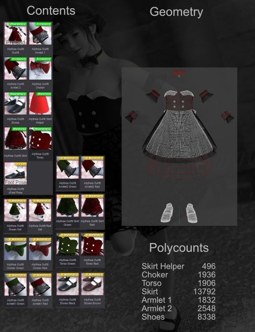 Alythea Outfit is a cosplay outfit set for Genesis 9 female characters. It includes Skirt Helper, Choker, Torso, Skirt, Armlet1, Armlet2, and Shoes. The Skirt Helper is an aid object for inflating the skirt shape.