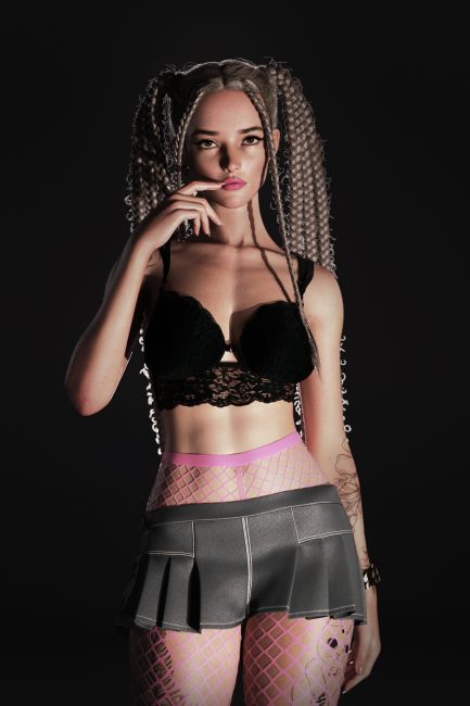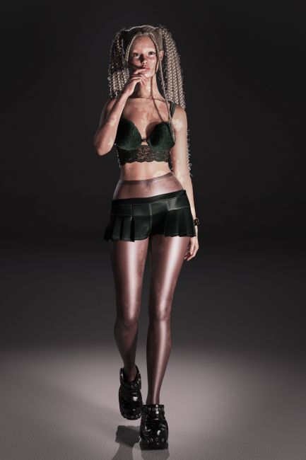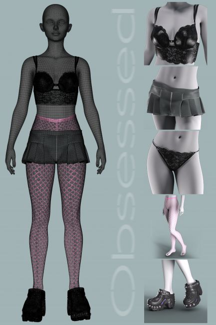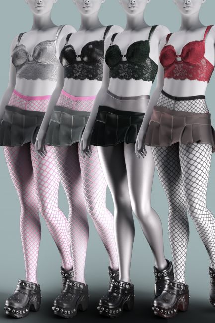 Obsessed Outfit for Genesis 9 is a bold, digitally sculpted ensemble designed to command attention. Featuring a black lace bralette, a pleated mini skirt, pink fishnet stockings, and studded platform shoes, this look seamlessly blends edgy streetwear with a high-fashion attitude. Perfect for character renders that channel confidence, rebellion, and allure, the outfit showcases detailed textures and dynamic draping optimized for Genesis 9's expressive poses. Ideal for cyberpunk, nightlife, or avant-garde scenes.