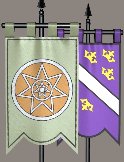 Add pageantry to your renders with these beautiful dynamic gonfalons for Poser. Set includes 7 shapes each with two textures and 3 pole styles to hang them from. Also included are 8 single surface materials for the pole and an additional material to hide the tips and ball on the end of the poles for a less martial look.