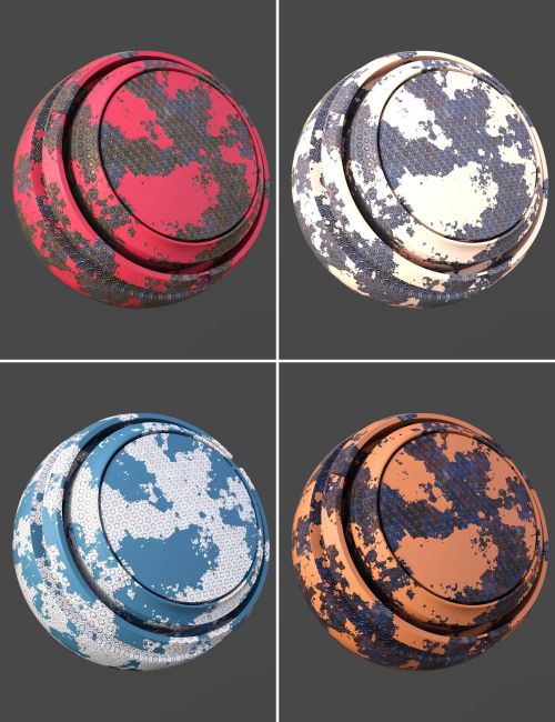 Painted Hex Metal Iray Shaders - Elevate your renders with this premium set of Iray shaders featuring 4K maps, 15 tiling presets, and 5 distinctive hex-and-paint patterns.