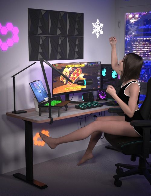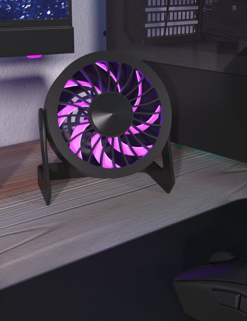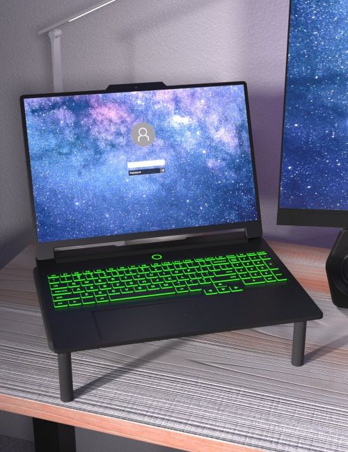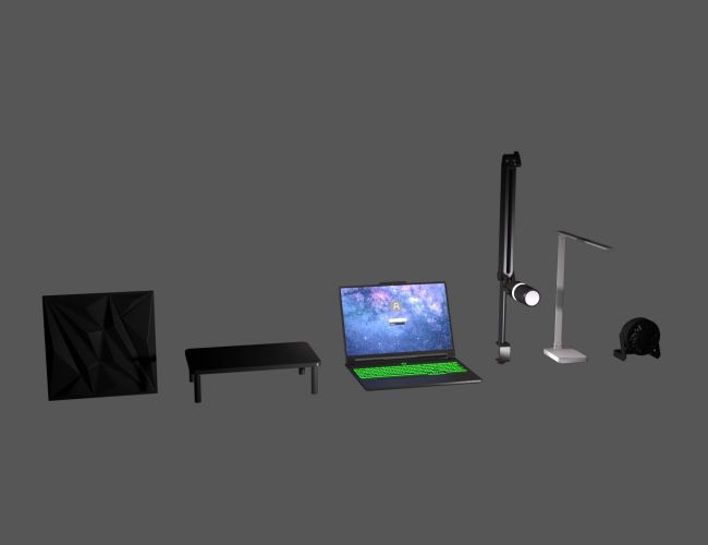 A computer peripherals and accessories props pack featuring six props -- a detailed and rigged gaming laptop, laptop stand, microphone with boom arm, desk fan, and desk lamp as well as a static wall art panel. All six props can be used as-is in order to integrate them into your existing scenes. This is a versatile props pack that will elevate your computer gaming/streaming and general computing renders.
